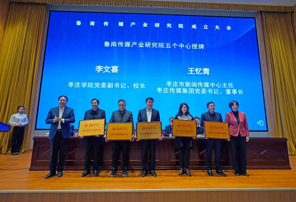 李文喜和王忆青共同为枣庄市新媒体创新研究中心、枣庄市影视制作中心、枣庄市数字艺术创意中心、枣庄市艺术展演中心、枣庄市少儿艺术传播与发展中心授牌。