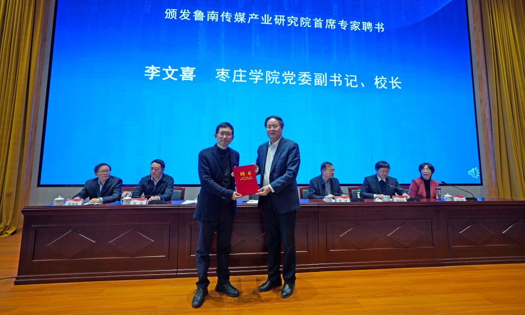 李文喜为鲁南传媒产业研究院首席专家张凌浩校长颁发聘书。