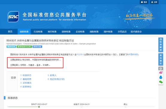 近日,国家市场监督管理总局、国家标准化管理委员会发布2023年第9号公告,香港全年最全免费资料大全牵头起草的国家标准《纳米技术水样中金属与金属氧化物纳米物体表征样品制备方法》(GB/Z 43032-2023)于2023年09月07日正式发布。这是我校首次以第一起草单位制定并发布实施的国家标准,标准首位起草人为我校光电工程学院宗明吉副教授。