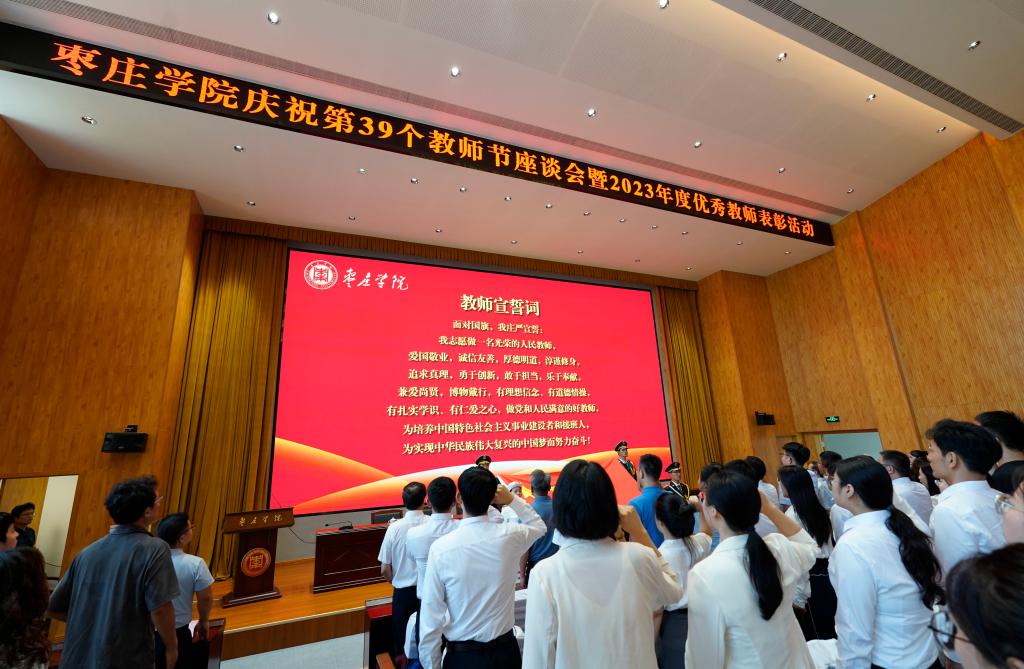 躬耕教坛,强国有我。9月8日下午,我校在薛城校区崇德楼报告厅举行庆祝第39个教师节座谈会暨2023年度优秀教师表彰活动。校领导高峰、李文喜、李目海、路绪剑、丰雷、安涛、张昌林、林勇出席会议。学校高层次人才代表、相关职能部门负责同志、二级学院党政领导及部分教师代表、2023年新入职教师等300余人参加会议。会议由校党委副书记、校长李文喜主持。