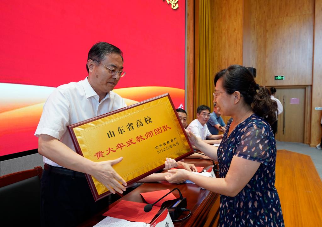 校党委书记高峰先后为入选第三批“山东省高校黄大年式教师团队”,山东省高校青年教师教学比赛一等奖获得者、生命科学学院教师李媛媛以及三等奖获得者、马克思主义学院教师程诚颁奖。
