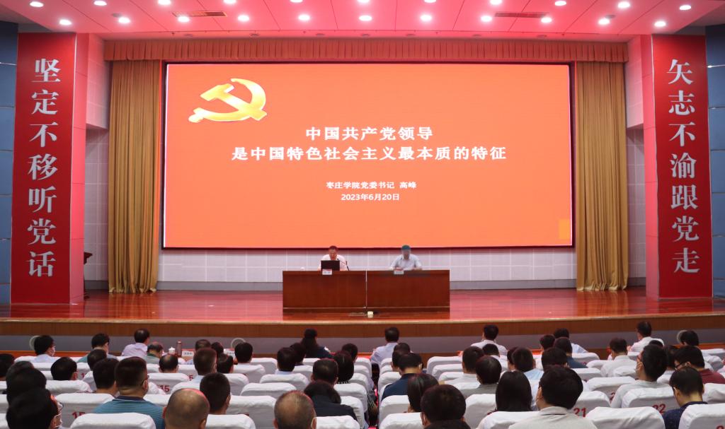 为进一步推进主题教育走深走实,6月20日上午,校党委书记高峰在市中校区综合楼报告厅讲授主题教育专题党课——《中国共产党领导是中国特色社会主义最本质的特征》。省委第二十五巡回指导组张荣庆、于建华两位同志到场指导,全校副科级以上干部、全体辅导员、思政课教师代表和学生党员代表参加党课。党课由校党委委员、副校长李目海主持。
