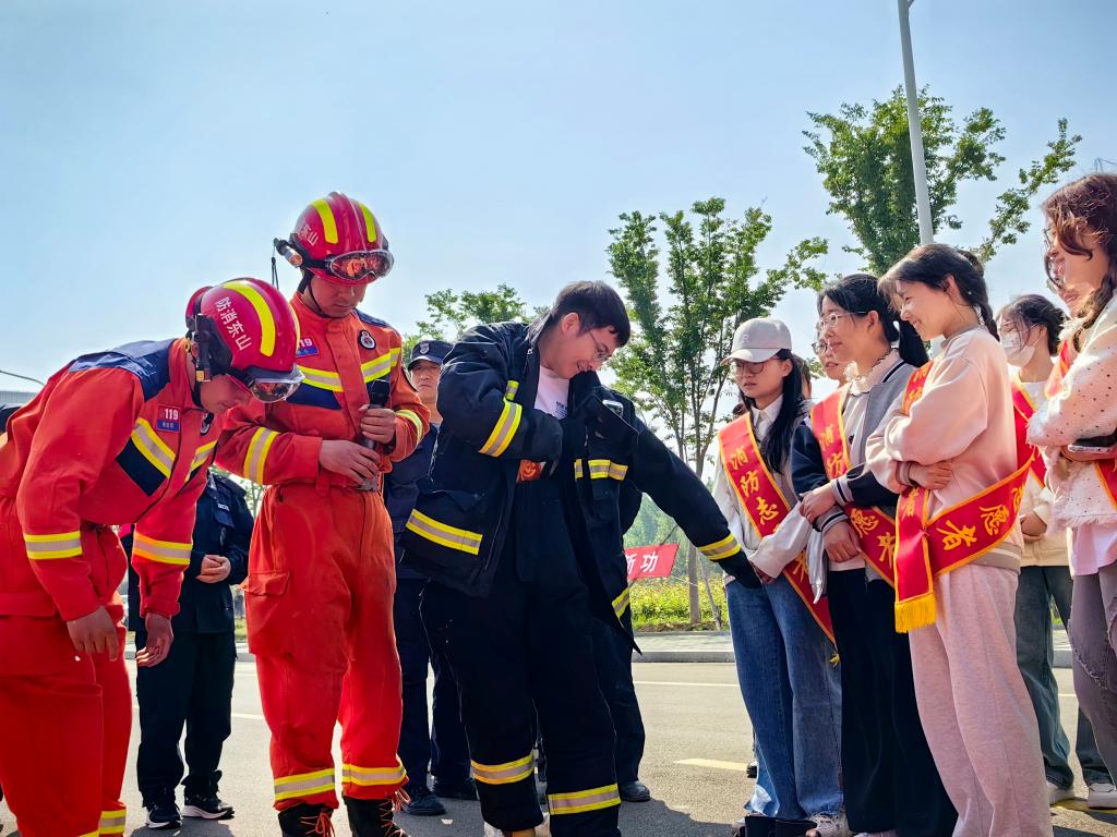 仪式结束后,区消防救援大队人员为我校消防志愿者现场讲解了各类消防器械的使用场景及使用方法,并现场进行演示。