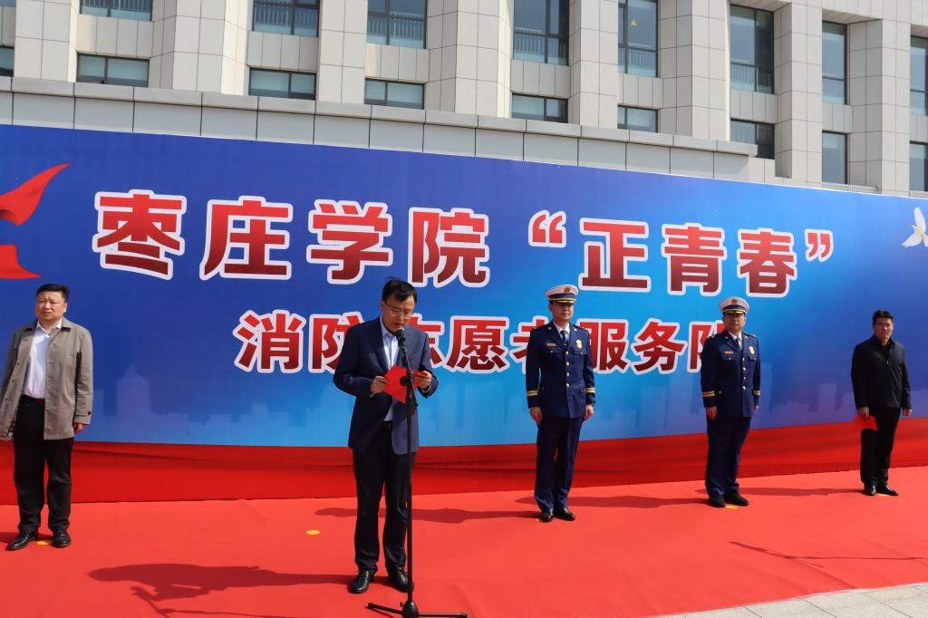 4月27日上午,我校联合薛城区消防救援大队在薛城校区举行“正青春”消防志愿者服务队授旗仪式。学校党委委员、统战部长、薛城校区管委会主任林勇,薛城区消防救援大队教导员曹昌亮、大队长王磊出席仪式。校团委、保卫处负责人,学生消防志愿者代表,区大队消防救援人员代表参加仪式。