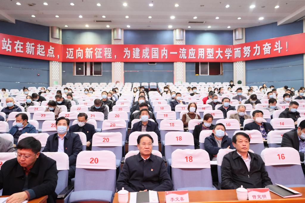 曹胜强强调,学习宣传贯彻党的二十大精神是当前和今后一个时期全党全国的首要政治任务。要深刻领悟“两个确立”的决定性意义,用习近平新时代中国特色社会主义思想武装头脑。要立足落实立德树人根本任务,紧紧围绕建设国内一流应用型大学中心工作,以学校第三次党代会确定的“十大工程”为抓手,坚持和加强党对学校工作的全面领导,全面提高人才培养质量、科学研究水平、社会服务与文化传承创新的能力。着力在加强优势学科和特色专业建设、创新人才培养模式、加强人才队伍建设、提升科研服务能力、拓展合作办学领域,加快推进硕士学位授权单位建设上下功夫,努力开创学校事业高质量发展新局面。