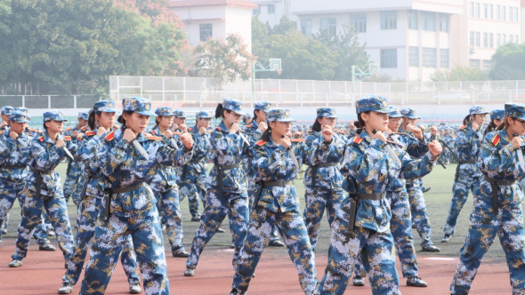 伴着昂扬的旋律,新生们以飒爽英姿进行了军训科目汇报表演,包括字形方队、队列展示、擒拿格斗组合操、战术方队等内容。教官和学生精心编排,队伍先后变换出“飞机、红船、改革开放、新时代、二十大”等字样,以队列表演的形式为迎接党的二十大召开献礼。