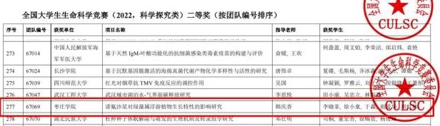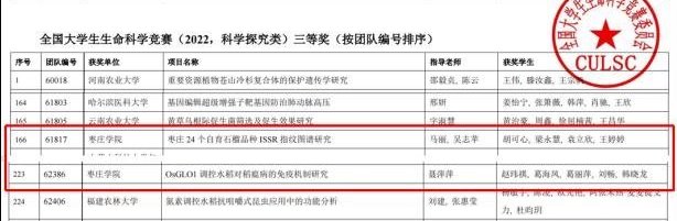 大赛分为网络评审和决赛线上评审两个阶段。生命科学学院53件作品参与网络初评,最终15件作品入围省决赛,3件作品入围全国决赛。经过网络评审和线上答辩,由教师韩庆香指导的李晓菲等团队成员作品《诺氟沙星对绿藻属浮游植物生长特性的影响研究》荣获全国大学生生命科学竞赛二等奖;由教师马丽和吴志苹指导的胡可心等团队成员作品《枣庄24个自育石榴品种ISSR指纹图谱研究》和教师聂萍萍指导的赵玮祺等团队成员作品《OsGLO1调控水稻对稻瘟病的免疫机制研究》,荣获全国大学生生命科学竞赛三等奖。