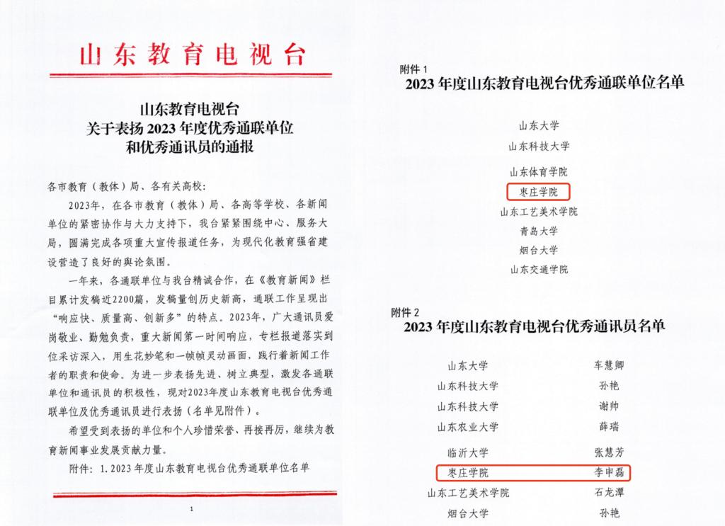 1月18日,山东教育电视台印发《山东教育电视台关于表扬2023年度优秀通联单位和优秀通讯员的通报》,我校荣获“2023年度山东教育电视台优秀通联单位”殊荣,党委宣传部李申磊老师获评“2023年度山东教育电视台优秀通讯员”称号。