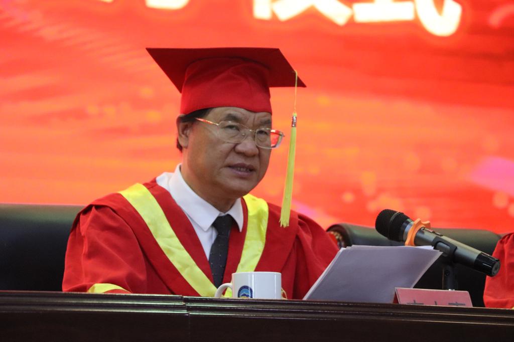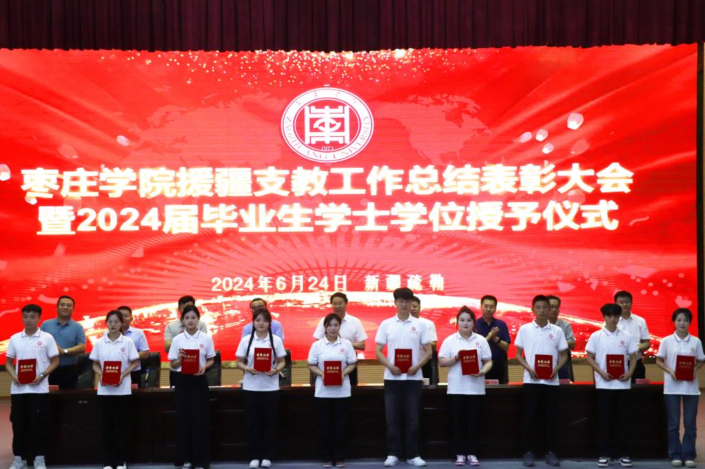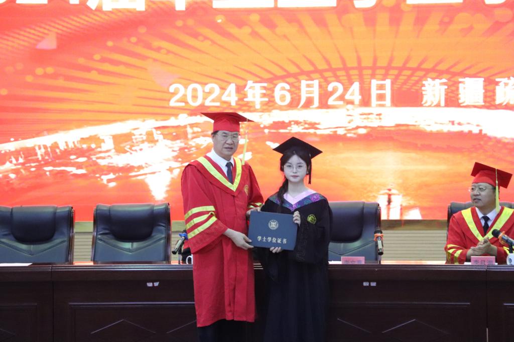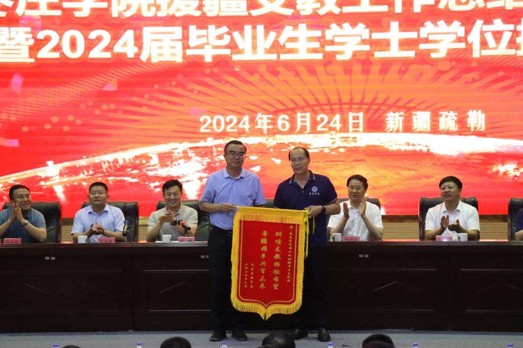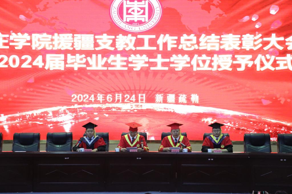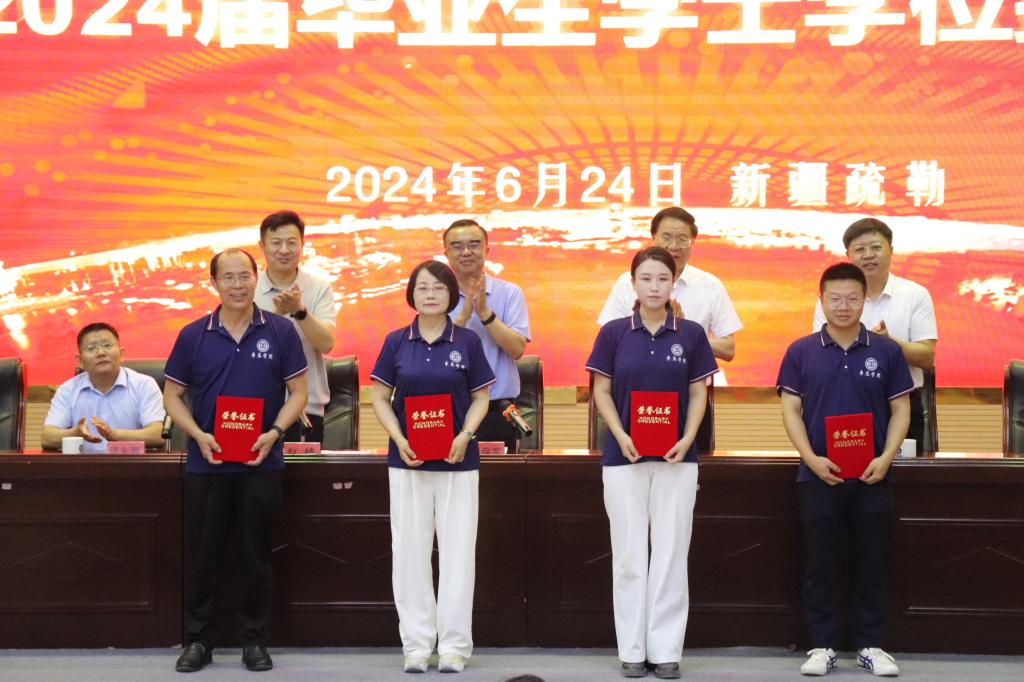 大会第二阶段进行了援疆支教毕业生学位授予仪式,李目海主持仪式。科技处处长房永磊宣读授予支教团2024届本科毕业生学士学位的决定。李文喜为他们拨穗正冠、颁发学士学位证书并合影留念。