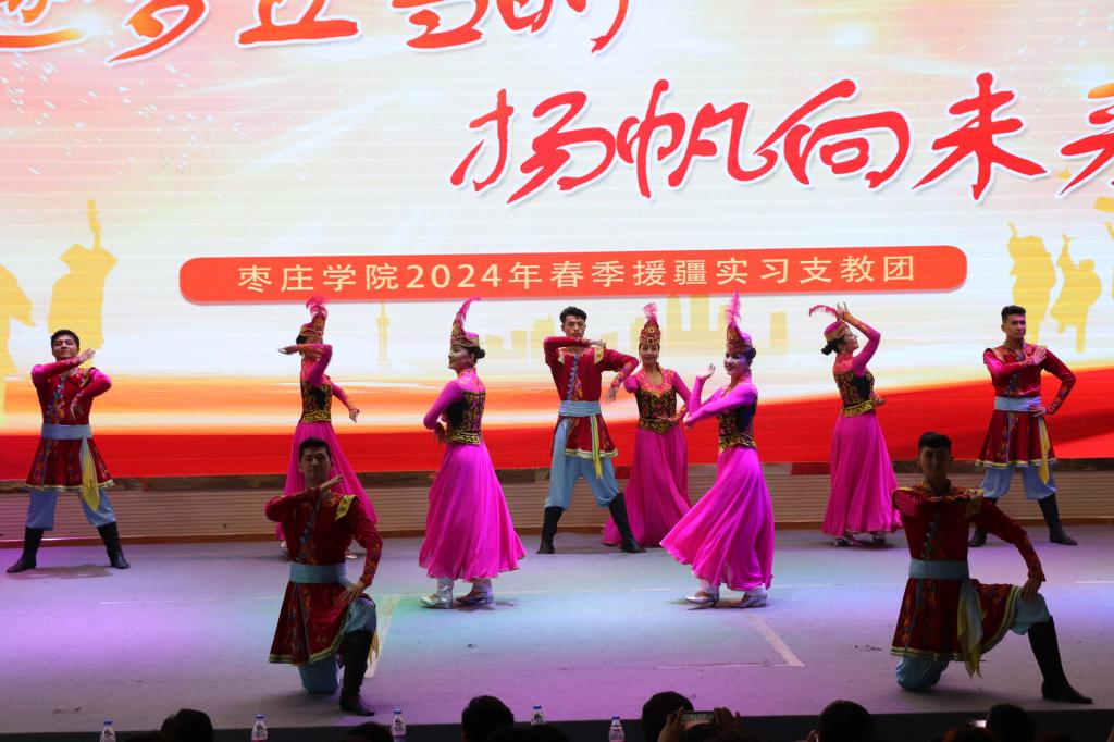 支教团团长张怒代表支教团对山东省、东营市两级援疆指挥部,喀什地区、疏勒县两级教育主管部门的大力支持和帮助表示感谢,并汇报了支教团基层党组织建设和日常工作开展情况:支教团抓党建,凝聚奋进力量;抓教学,突出工作中心;抓管理,确保安全有序;抓服务,弘扬奉献精神;抓活动,充实支教生活。支教学生代表魏文婕在发言中汇报了支教团成员在支教过程中取得的收获和今后打算。