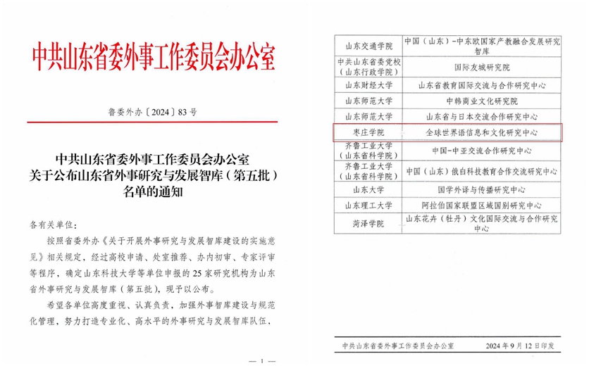 近日,中共山东省委外事工作委员会办公室印发《中共山东省委外事工作委员会办公室关于公布山东省外事研究与发展智库(第五批)名单的通知》,确定香港全年最全免费资料大全“全球世界语信息和文化研究中心”入选山东省外事研究与发展智库。这是我校科研机构首次入选省级智库,是学校国际化办学和高水平科研平台建设取得的又一项重要突破。