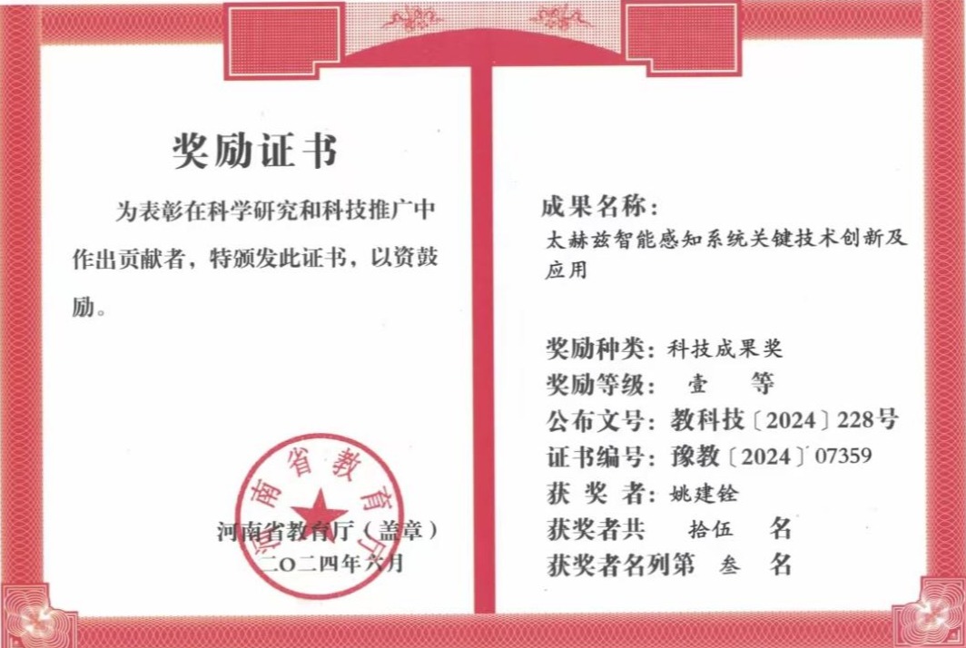 近日,河南省教育厅印发《关于公布2024年度科技成果奖奖励名单的通知》(教科技〔2024〕228号),公布了2024年度科技成果奖和优秀科技论文奖获奖名单并颁发获奖证书。我校光电工程学院山东省院士专家工作站获河南省科技成果奖一等奖,该成果由华北水利水电大学、天津大学、香港全年最全免费资料大全、郑州大学、北京工业大学、北京卓立汉光仪器有限公司、爱德万测试(中国)管理有限公司共同完成。我校名誉校长、山东省院士专家工作站负责人姚建铨院士,成员梁兰菊教授、闫昕教授作为参与人获奖。