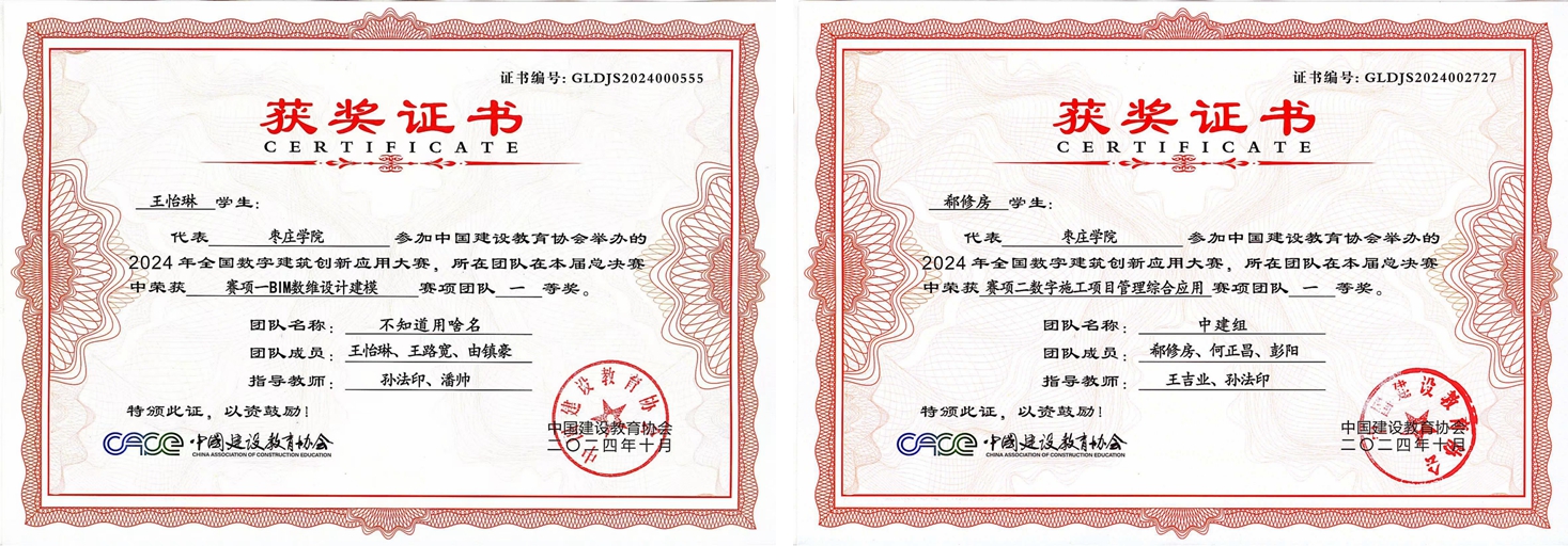 近日,在2024年全国数字建筑创新应用大赛总决赛中,我校城市与建筑工程学院共派出4个参赛团队,并全部获得全国一等奖。孙法印、王吉业、裘娜、潘帅老师获优秀指导教师荣誉称号。