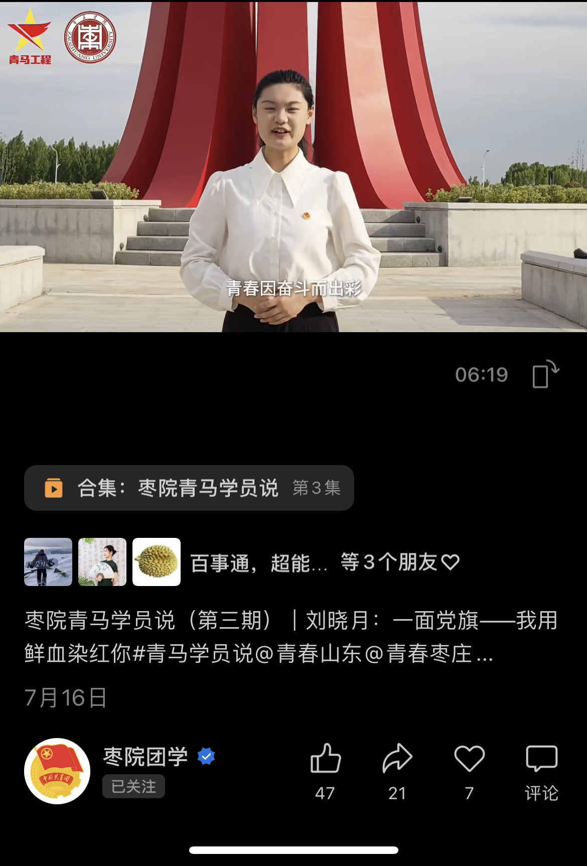 聚焦思想铸魂,强化学生理想信念教育。学校坚持把政治引领放在首位,用“青言青语”阐释党的创新理论,构建了“青年大学习”“青马工程”“青马讲师团”“青春思政课”一体化思想引领工作体系。持续深化“青年大学习”。构建“导学、讲学、研学、比学、践学、督学”六位一体的学习体系,并充分调动学生党员、团学干部先锋模范作用,形成“比学赶超”的局面。深入实施“青马工程”。印发《青年马克思主义者培养工程实施方案》,建立校、院两级培训体系。同时,紧紧围绕理论学习、红色教育、素质拓展等课程模块,坚持理论与实践相结合、教育引导与满足需求相结合的原则,贯穿整年开展集中授课、主题分享、素质拓展、志愿服务、结业考核等多样化的培训内容。近三年累计培训学员6000余人次。坚持用好“青马讲师团”。专门组建了由团干部、优秀学生骨干组成的“青马讲师团”,依托“青马工程”培训、暑期“三下乡”、主题团日、仪式教育等载体,深入各支部常态化开展主题宣讲和教育培训活动。用情讲好“青春思政课”。以传统文化节日、重大节日为契机,通过组织国旗下的演讲、主题团日、读书交流会等活动,引导学生树立正确的世界观、人生观、价值观。建强“枣院团学”新媒体矩阵,以青年喜闻乐见的形式推出“青马学员说”“团·青风采”“枣·青春”等新媒体产品。栏目已发布92期,累计阅读量达10万余人次。