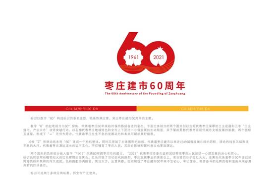 标识以数字“60”构成标识的基本造型,从标识的动势、造型元素、色彩、寓意等方面进行创意表现,充分体现了地域特色,融入了时代元素,突出了设计主题。作品饱满庄重、协调醒目、简洁大方,生动展现了枣庄建市60年来不忘初心、牢记使命、艰苦奋斗的光辉历程和面向未来奋勇向前的昂扬姿态。