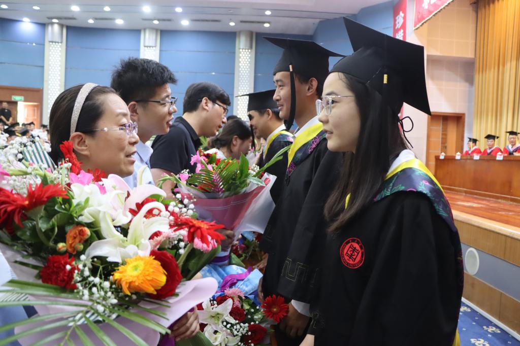 典礼上,20名毕业生代表向教师代表敬献鲜花,深切表达了对母校的深深眷恋、对师长的无限感激以及对校园生活的依依不舍。典礼在浓情厚意、充满感动的氛围中顺利落下帷幕。典礼结束后,校领导和毕业生代表在综合楼前合影留念。
