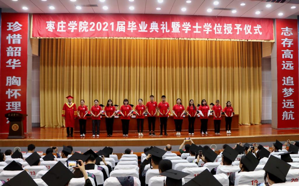 毕业典礼坚持以文化人、文化育人。印有“志存高远 追梦远航”“珍惜韶华 胸怀理想”字样的对联写真分列在会场两侧,鲜红的写真激励着毕业生们承时代使命、展奋斗风采,也祝福着毕业生们毕业快乐、鹏程万里。典礼前,播放了学校为2021届毕业生精心制作的毕业生MV《记念•枣院版》,动人的旋律、精心制作的视频,每一帧每一句都轻轻敲在学子心坎,久久萦绕脑海,泛起点点涟漪。下午三点整,在庄严雄壮的国歌声中,毕业典礼暨学士学位授予仪式正式拉开帷幕。