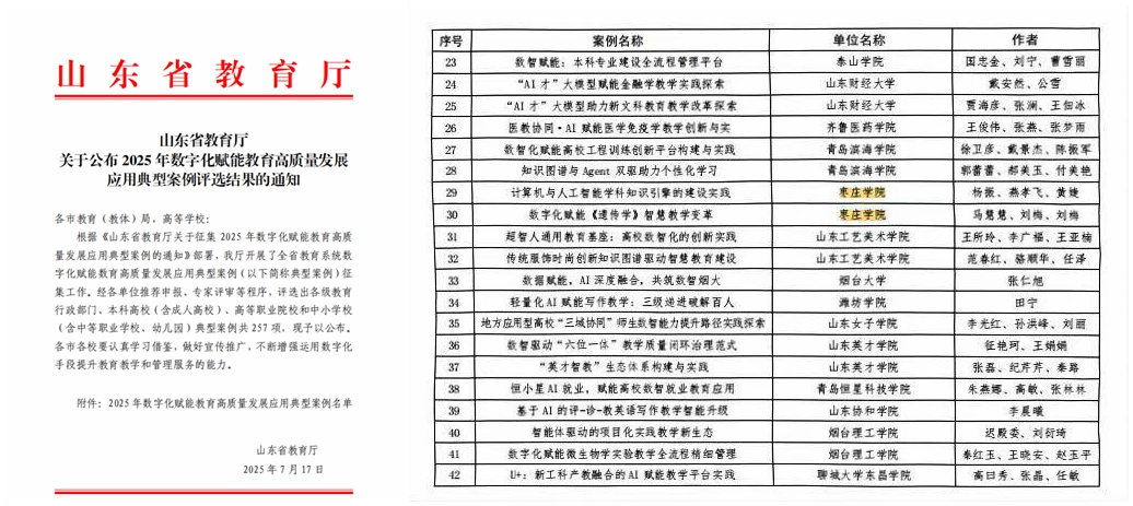近日,山东省教育厅公布了2025年数字化赋能教育高质量发展应用典型案例评选结果,我校遴选报送的信息科学与工程学院(人工智能学院)的《计算机与人工智能学科知识引擎的建设实践》和生命科学学院的《数字化赋能<遗传学>智慧教学变革》两项案例全部入选。据悉,此次全省本科高校共评选出典型案例56项。