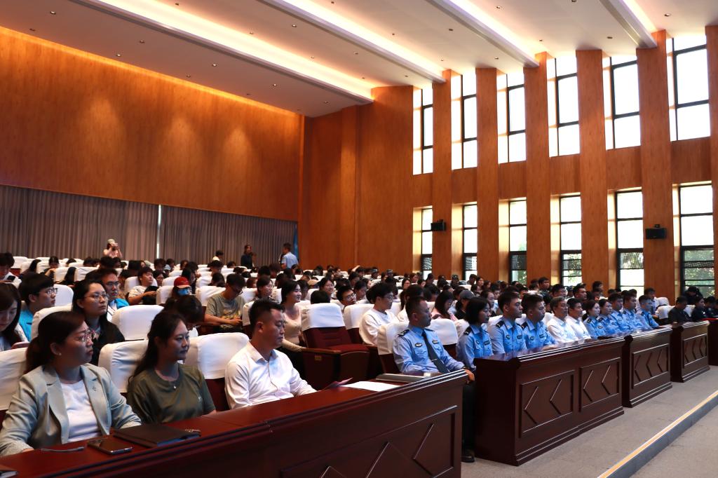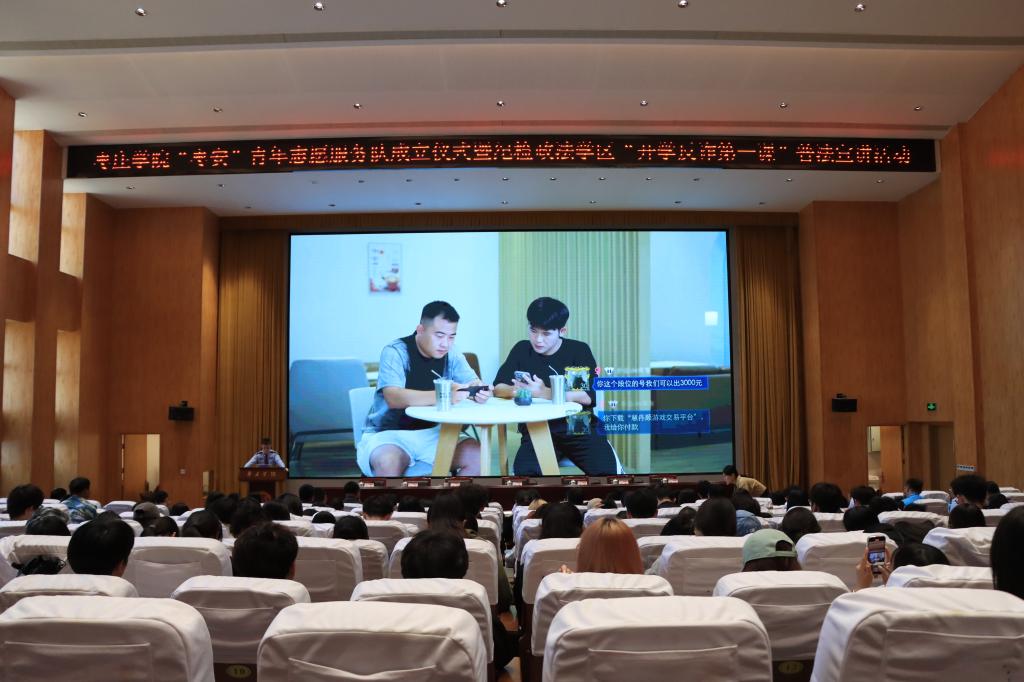 成立仪式结束后,“纪检政法学区开学反诈第一课”普法宣讲迅速拉开帷幕。由枣庄市公安局刑侦支队民警、禁毒支队民警、枣庄市中级人民法院等组成的专业宣讲团,深入剖析“刷单返利”“网游产品虚假交易”“冒充平台客服”等常见诈骗手法,通过讲解典型案例警示犯罪风险,并以创新的脱口秀形式普及禁毒知识。