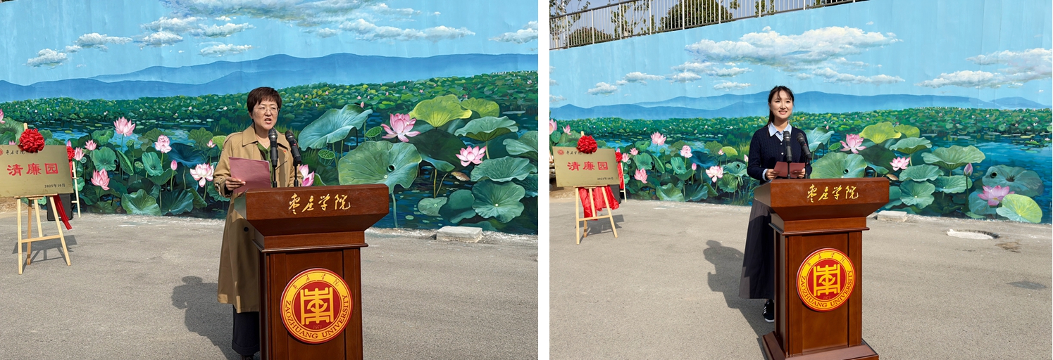 高峰在致辞中指出,近年来,学校深入贯彻落实习近平总书记关于党的自我革命的重要思想和省委关于全面建设清廉山东、清廉学校的部署安排,始终把加强新时代廉洁文化建设作为落实全面从严治党和一体推进“三不腐”的基础性工程,坚持以制固廉、以警促廉、以红养廉、以文育廉、以学倡廉,全力打造“清廉枣院”品牌,推动学校廉洁文化建设走深走实、卓有成效。“清廉园”既是我们弘扬廉洁文化、涵养清风正气的生动实践,也是我们纵深推进全面从严治党、加强新时代廉洁文化建设的崭新举措。今后,要持续深耕校园廉洁文化建设,将其打造成为展示学校建设成果的重要窗口和交流平台,打造成全校师生理想信念的“固本园”、师德师风的“淬炼园”、青年学子的“修身园”、清廉文化的“传播园”,让清风正气在校园蔚然成风。