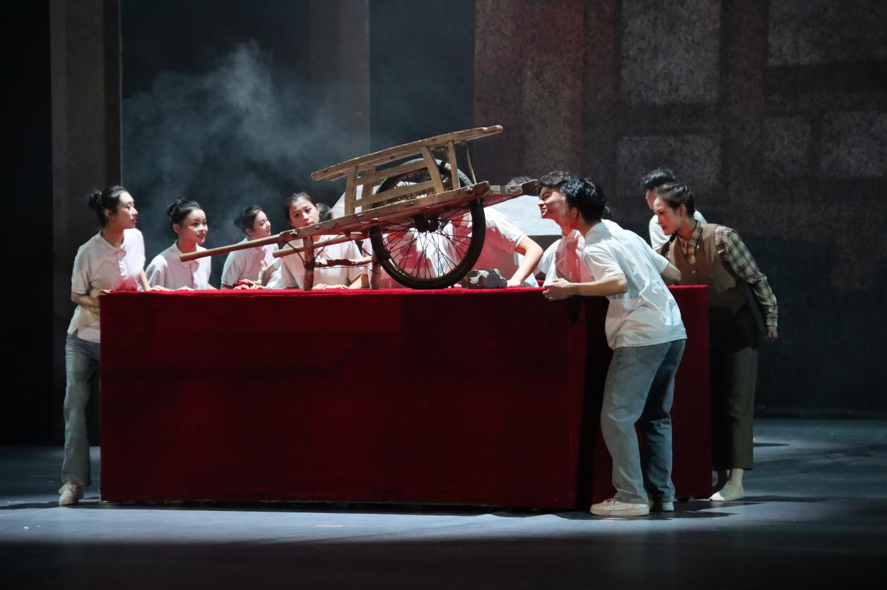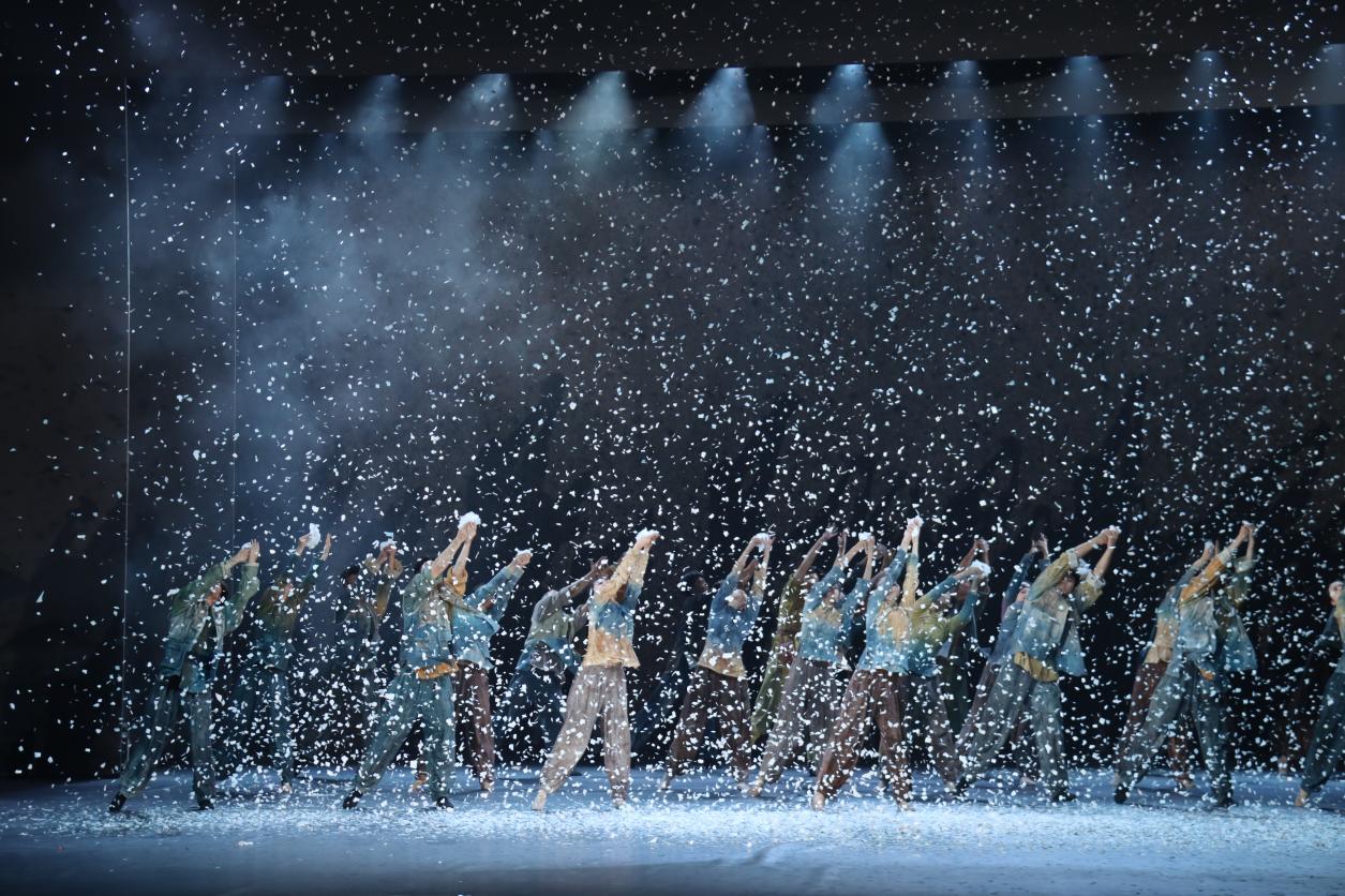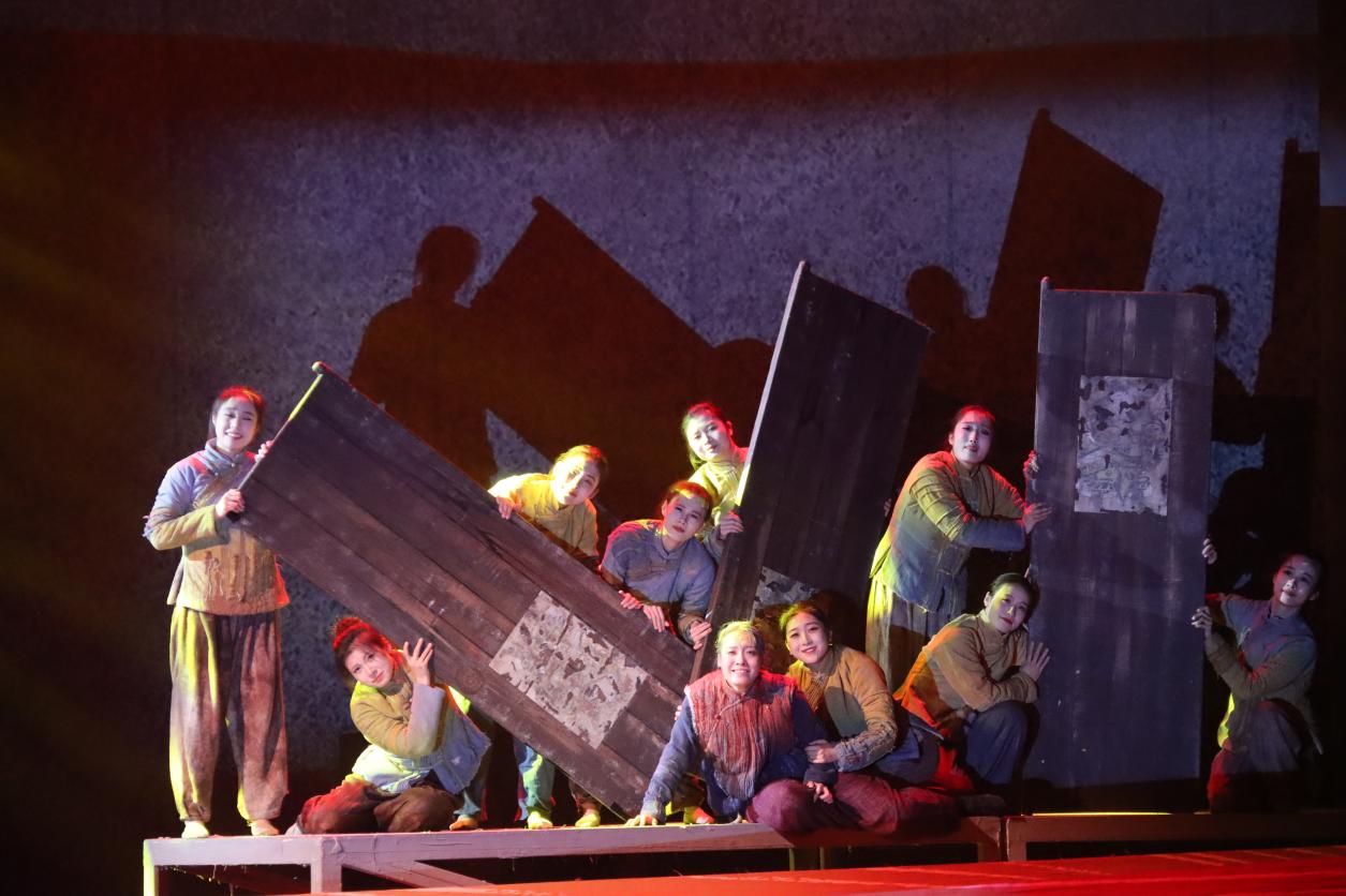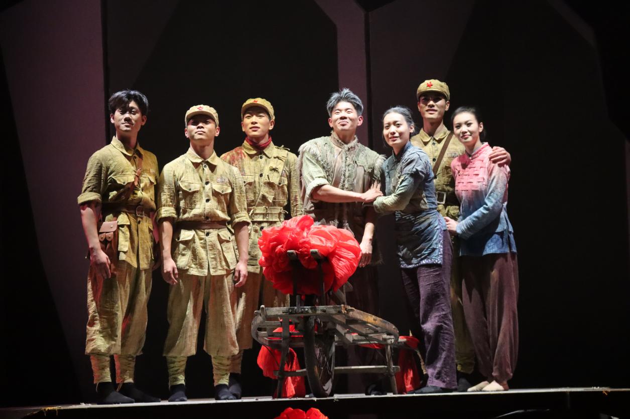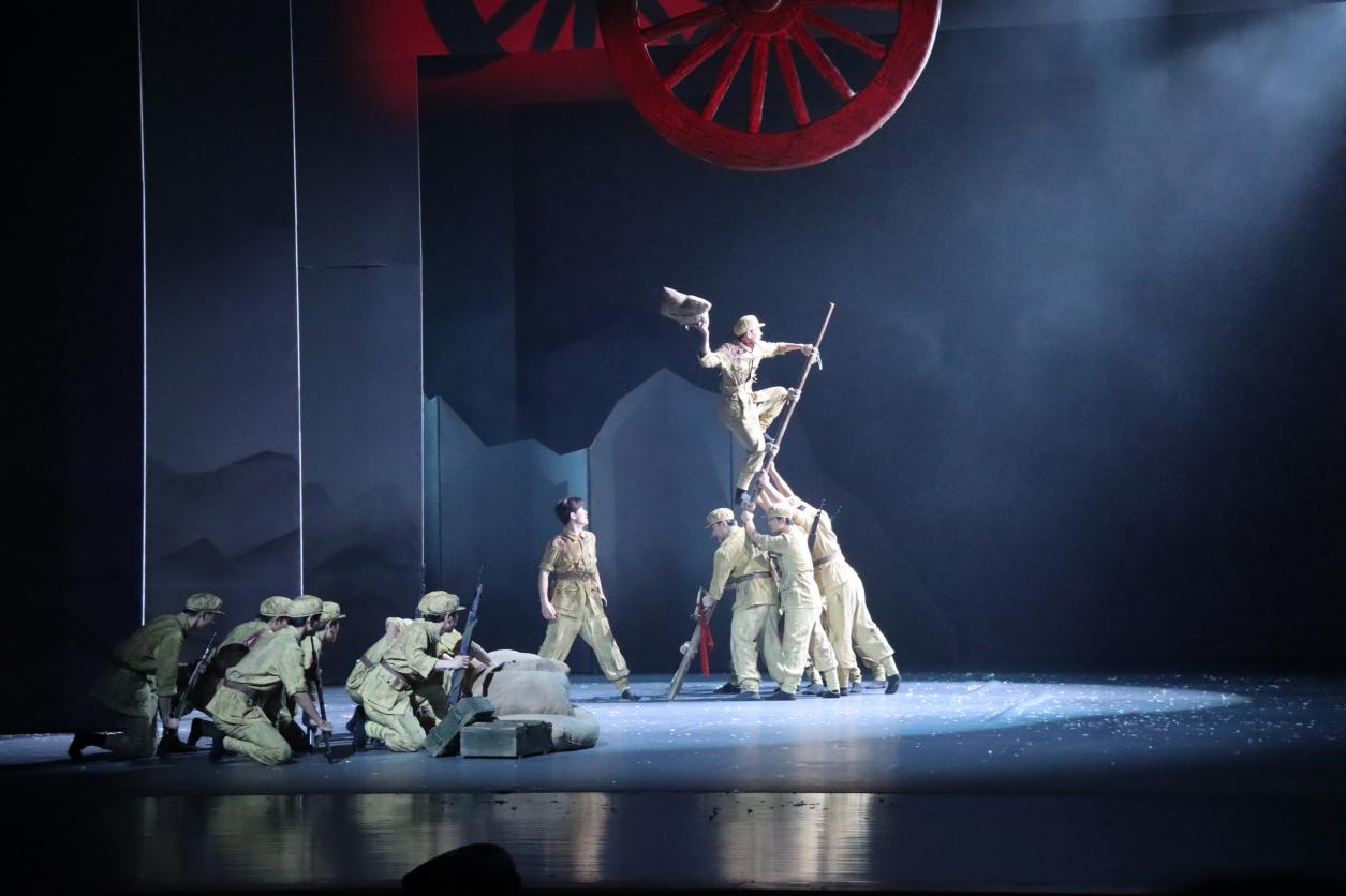 全剧精心设计序《风光》、四幕《风云》《风烟》《风涛》《风华》及尾声《长风》的完整结构,创新采用回旋曲式与“多线并进”的叙事手法,将“独轮车”、“纺车”等承载着厚重历史的革命文物转化为鲜明的舞台意象,让观众在肢体艺术的流转中,直观感受信仰的温度与情感的共鸣。演出中,灯光、舞美与多媒体影像的巧妙融合,既营造出战争年代的宏阔背景,又细腻勾勒出人物的情感世界,打造出沉浸式的观演空间,让红色文化的崇高感与震撼力直抵人心。