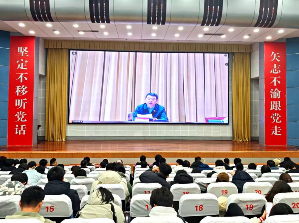 报告会在薛城校区举行,市中校区设分会场,以视频直播形式收听收看。学校处科级干部、师生代表,枣庄市教育局领导班子成员,市委办公室机关第一党支部全体党员等700余人参加报告会。