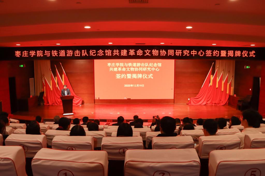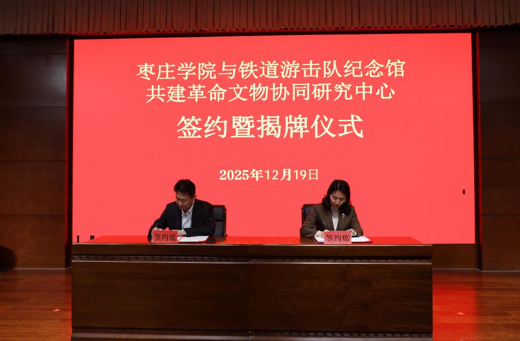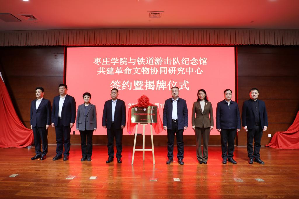 12月19日,我校与铁道游击队纪念馆共建革命文物协同研究中心签约暨揭牌仪式在铁道游击队纪念馆报告厅举行。校党委书记高峰,党委委员、副校长褚夫敏,薛城区委书记巴海峰,区委常委、区委办公室主任孙发伟等出席仪式。仪式活动由薛城区委常委、宣传部部长崔晖主持。
