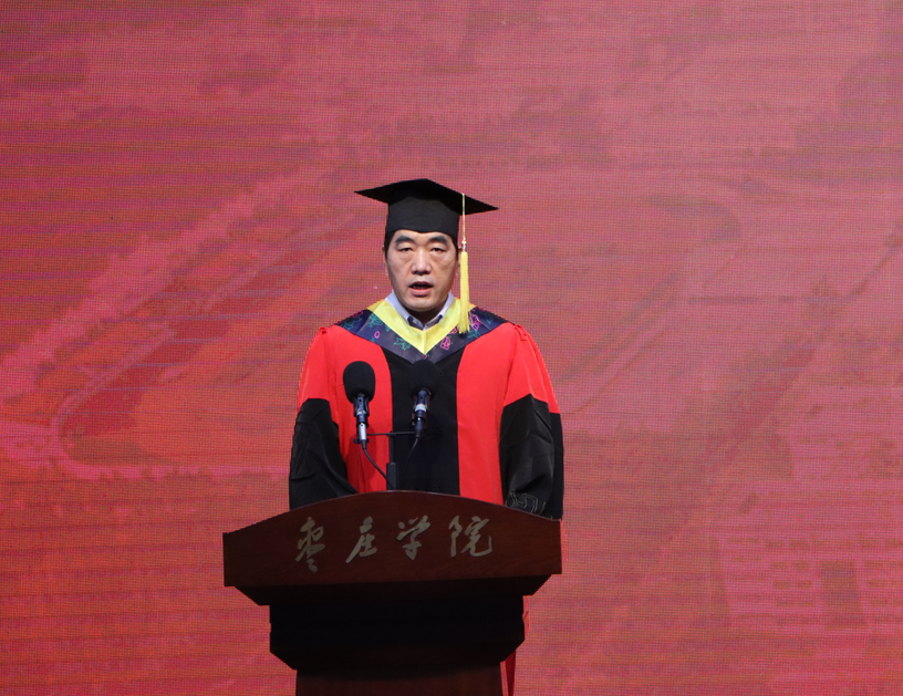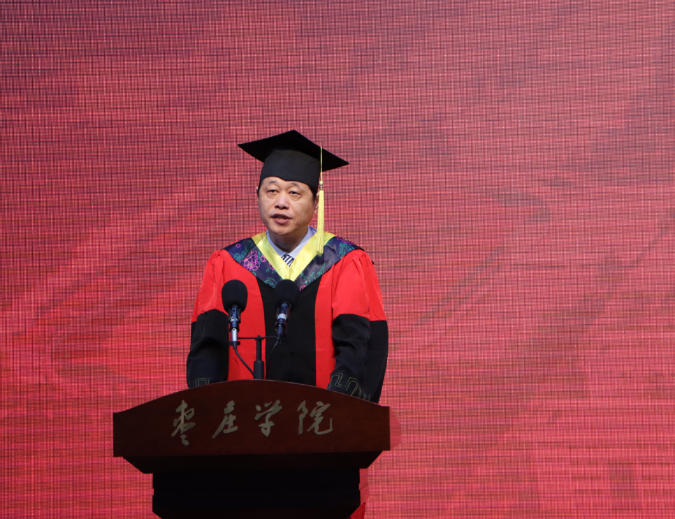 对即将踏上新征程的同学们,李东提出四点殷切期望:一是要厚植“胸怀大我”的家国情怀,争当爱党爱国的践行者。热爱祖国、报效祖国是每个枣院人的心之所系、情之所归,希望同学们坚定理想信念、厚植爱国情怀,以青春之我、奋斗之我,勇做走在时代前列的奋进者、开拓者、践行者,书写无愧于时代的青春之歌和精彩人生;二是要勇担“我将无我”的为民使命,争当服务人民的实干家。疫情期间,我校300余名青年学生以多种形式主动投身到新冠肺炎疫情防控阻击战中,勇于担当、不负时代是枣院人的初心所在、使命坚守,希望同学们脚踏实地、不务虚功,大力践行“西迁精神”,以无我之境界,实现有我之担当;三是要永葆“拼搏忘我”的奋斗姿态,争当时代发展的弄潮儿。砥砺奋斗、攻坚克难是枣院人的不屈精神和优秀品质,希望同学们珍惜韶华、不负时代,让青春在磨砺中出彩,让人生在实现中国梦的奋进追逐中不断升华;四是要弘扬“建功有我”的创新精神,争当强国伟业的生力军。勇于探索、敢为人先、追求卓越是枣院人的力量源泉和不懈追求,期待同学们毕业后继续创新性学习、创造性思考,努力成为创新发展的中坚力量,成为强国伟业的生力军。