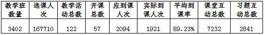 我校师生在雨课堂平台使用情况,根据大数据统计,由此查看本周教学班数量、教学活动总、开课总数、应到课人次、实际到课人次、课堂互动总数、平均到课率、习题互动总数,详情见下表: