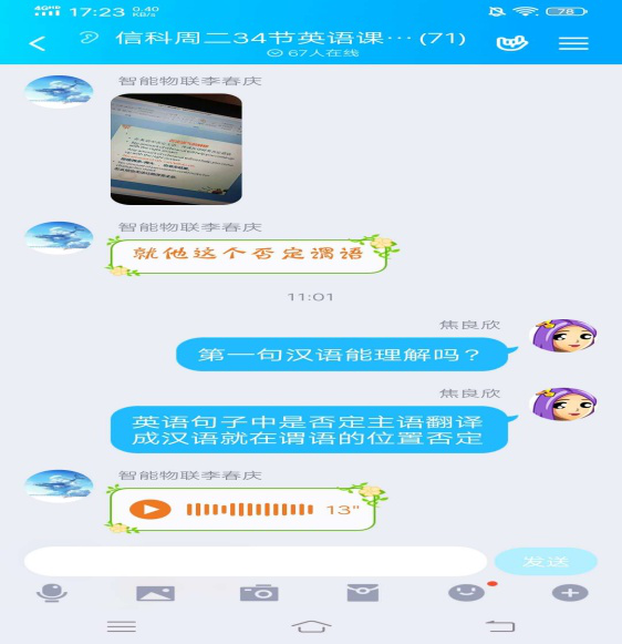 课上老师上传录制好的PPT课件,根据课件时长安排学生自主学习,记好笔记。等大部分学生看完录播内容后安排答疑环节。这一环节中,首先让学生主动提问,针对疑问老师会作出详细解释,并就具体问题让学生在群里展开讨论。如果短时间内没有学生提出疑问,老师将点名提问,也作为考勤抽查。