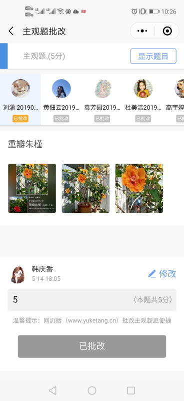 授课结束后将相应章节测试题等资料发布到雨课堂的学习资源库,及时收集学生的学习情况,了解他们的学习状态与效率。另外通过“翻转课堂”形式,让学生们在课前通过老师每周的预习教学视频,完成植物认知的学习,在课堂上与同学们分享所观察到的植物种类。通过课堂上合作探究、互动交流等活动促成学生对所学内容更深层次的理解。