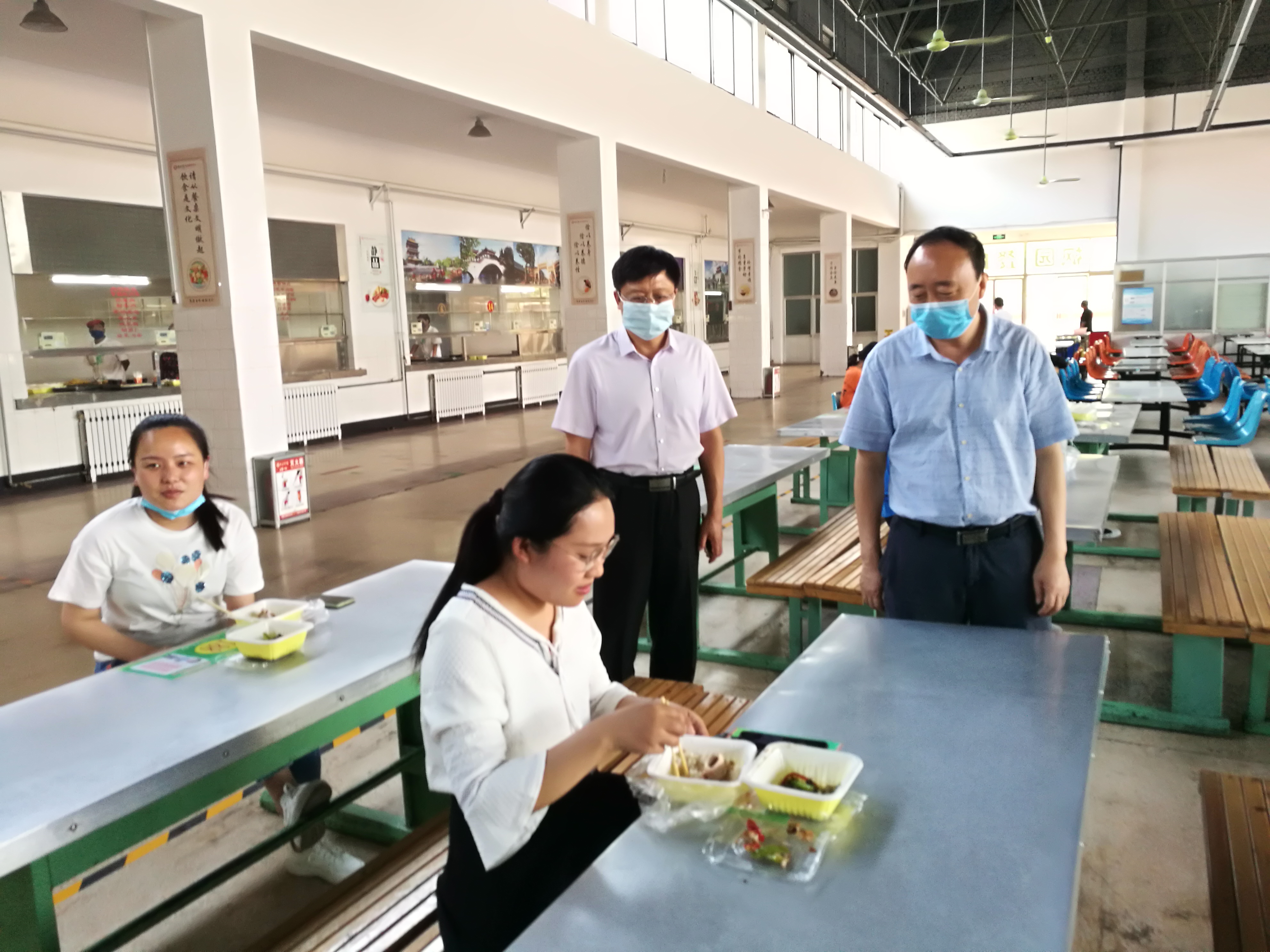 5月28日中午,校党委书记曹胜强、副校长李目海深入学生食堂实地调研,指导学生返校期间食堂疫情防控和错时错峰供餐等工作,并同学生一起在餐厅就餐,办公室、后勤服务处负责人陪同调研。