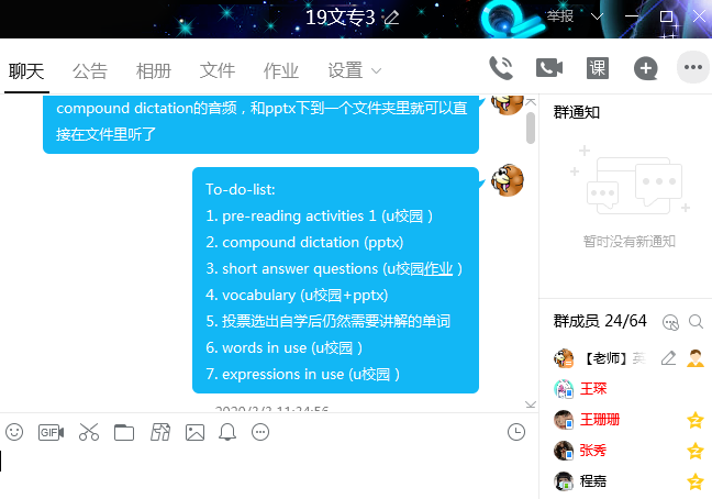 教师可根据教学进度安排,设定各课时教学目标及教学内容,指导学生通过“U校园”在课前基于教材进行自主学习。与此同时,在QQ群中上传相应的讲解文档和补充资料,供学生提前下载并预习。