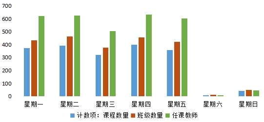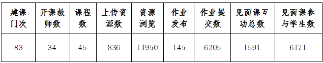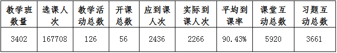 我校师生在雨课堂平台使用情况,根据大数据统计,由此查看本周教学班数量、教学活动总、开课总数、应到课人次、实际到课人次、课堂互动总数、平均到课率、习题互动总数,详情见下表: