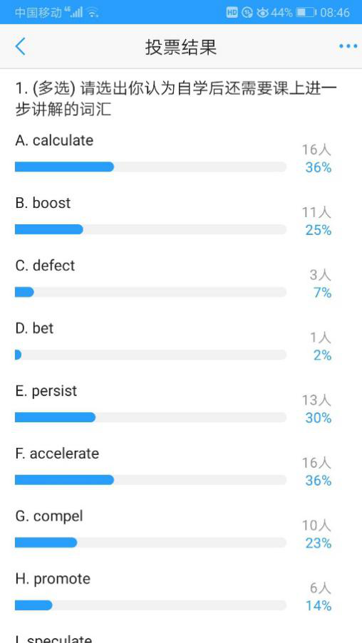 在上课过程中,可根据本次课学习目标,在U校园上发布较为简单的测试题,检查学生预习情况。学生自主学习情况的反馈也可借助“U校园”上的投票功能实现,例如,教师可在课前发布词汇学习的文件,要求学生在线下进行自学,学生完成自学任务后对认为需要进行深入讲解的词汇投票,教师根据投票率选择大多数学生的共性问题在课上统一讲解。