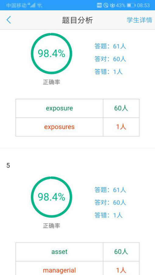 为帮助学生进一步明确并巩固每个单元的学习重点及难点,检测自己的掌握情况,借助“U校园”平台上的测试功能对每个单元都进行阶段性考核,并根据“U校园”的统计数据对答题正确率较低的知识点进行回顾重复以及进一步强调。