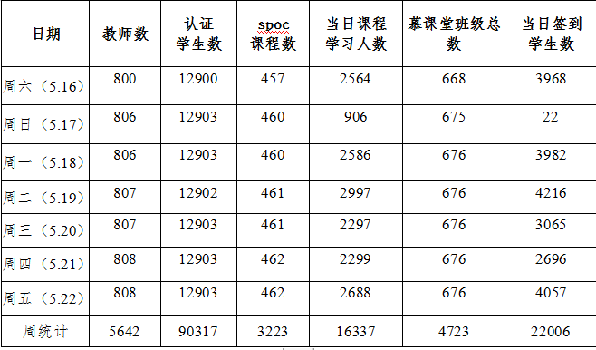本周运行课程累计3223门次,上线教师数5642人次,认证学生数90317人次,当日课程学习累计16337人次,慕课堂班级总数4723。