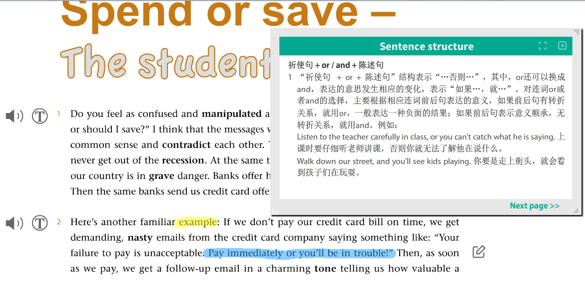 在实际教学过程中也在不断发现新的问题,例如有的学生没有电脑,只能通过手机听课,因此无法在观看教师的屏幕分享的同时打开电子教材。为解决这一问题,教师在教学中尽量把课本内容呈现在PPT中,再通过超链接衔接课文和知识点,并使用荧光笔高亮的方式进行标注讲解,或采用word文档等工具进行板书,尽最大可能帮助学生实现从线下课堂到线上课堂的过渡。