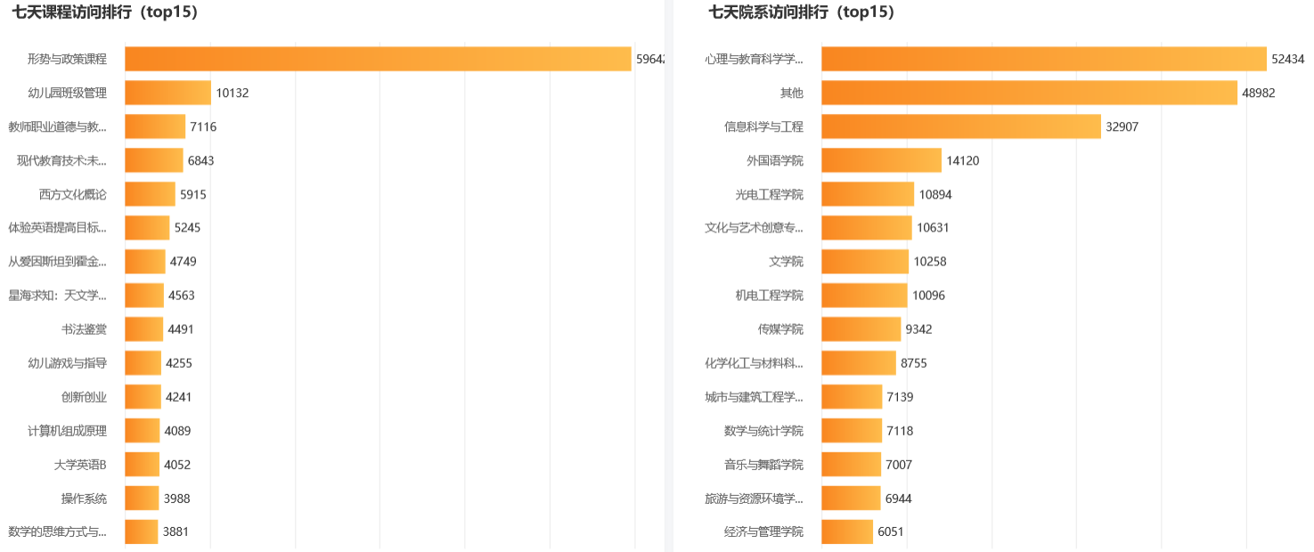 根据超星平台提供的大数据分析,可以查看本周课程打开次数、课程访问排行、较为频繁的活动类型、活跃度最高的院系和学习端口占比分别为: