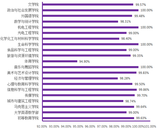 各院(部)的开课数、开课门次、班级数、教师数(人次)、学生数(人次)和学生上课率情况如下图所示: