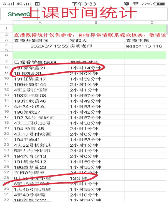 钉钉群授课在课程签到和互动环节都更便于操作,在直播结束后,后台便可以对每位同学的在线时长进行统计,这些数据对我们很有意义。将导出的数据发送到QQ群,对那些中途退出同学是一个威慑,同时也可以帮助我们更好地把握每一位学生的在线学习时长。
