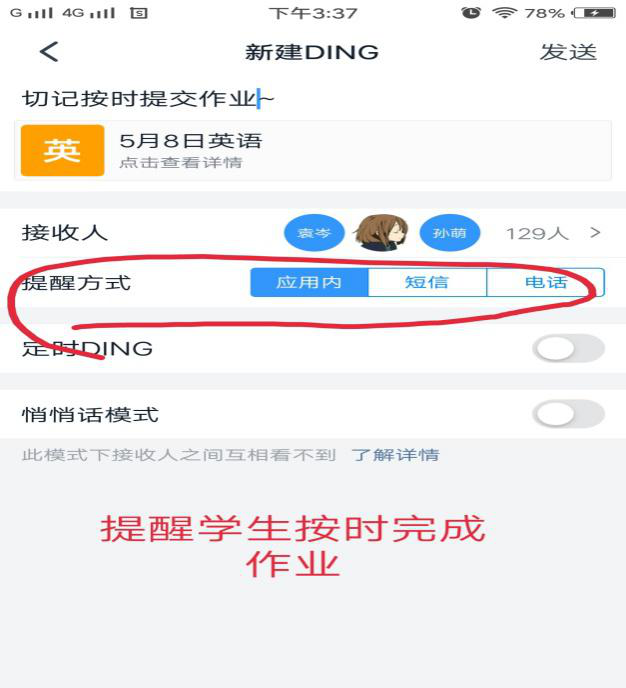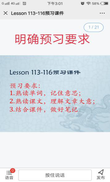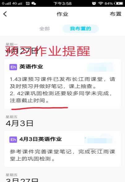 一、授课前,通过雨课堂发布预习课件,课件主要包括本周新授课要学习的单词讲解和课文阅读并辅以检测,预习课件中明确要求,让大家心中有数。发布预习任务后,及时通过QQ群和雨课堂教学日志的形式发布提醒。发布作业之后,还需要提醒学生,因为每次上课总有几个同学不能在规定时间内完成,然后解释说自己忘记了,因此一遍遍的督促很有必要。