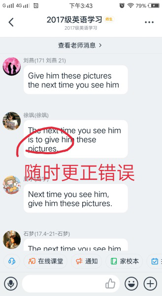 二、授课中,由于授课前已经对钉钉直播的功能进行了较为深入的研究,对各项功能的使用已比较熟悉。课前5分钟发起课程签到,考虑到网络延迟,上课5分钟后签到截止,在这之后进入课堂算作迟到。授课开始时首先结合雨课堂后台反馈的数据,对大家在巩固检测中错误率较高的题目进行讲解,本节课我们重点讲解了主观题部分的用单词适当形式填空,帮助大家巩固了语法知识的掌握。
