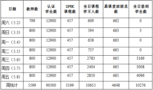 本周运行课程累计2741门次,上线教师数4790人次,认证学生数77395人次,当日课程学习累计15256人次,慕课堂班级总数3957。