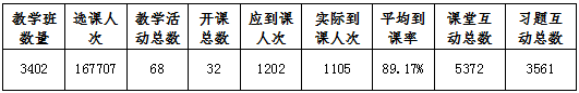 我校师生在雨课堂平台使用情况,根据大数据统计,由此查看本周教学班数量、教学活动总、开课总数、应到课人次、实际到课人次、课堂互动总数、平均到课率、习题互动总数,详情见下表: