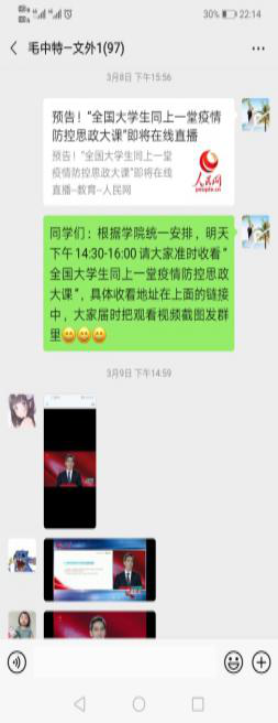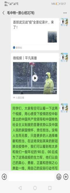 4、在课外做好时政热点的助学者。在做好日常线上教学工作的同时,我还充分利用学习强国、人民日报公众号等平台资源,搜集国际国内的时政热点、党和国家领导人的重要讲话等重要文章或视频发送到专业微信群供学生学习使用,使学生能够实时了解时政动态,增强他们的理论素养,从而做到全方位育人。