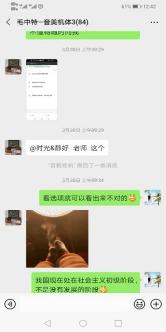 2、在课中做好知识学习的引导者。利用慕课堂小程序引导督促学生观看视频、及时签到、做好笔记、完成测试、参与讨论等,并利用专业微信群就相关的重要知识点和学生提出的疑难问题进行深化讲解、互动交流,使学生真正学懂、弄通、悟透马克思主义中国化的理论成果。与此同时,为防止隔空授课状态下学生上课“顾头不顾尾”、“出工不出力”的现象发生,我会在授课过程中随机点名、作答,以保证全员育人。