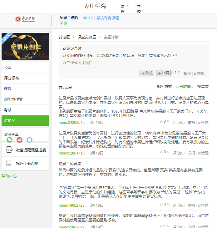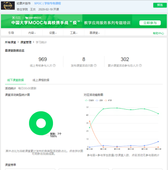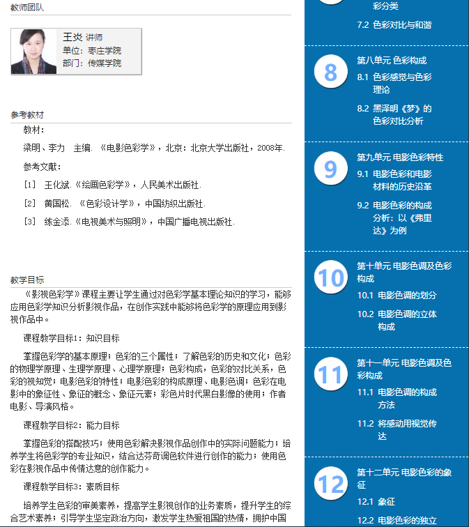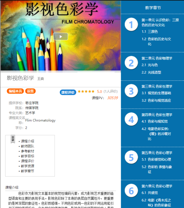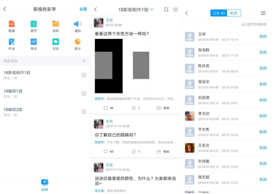 《纪录片创作》这门课程,利用“中国大学MOOC”平台慕课视频资源,采用异步SPOC的形式,建立教学班级,关联学生身份。按照教学计划发布教学内容、单元测试、课堂讨论、课后答疑、影视作品赏析等教学板块,布置学习任务。学生在线学习相关章节知识,完成章节后的练习题,同时记录好课堂笔记。教师可通过教学后台监督学生学习任务的完成情况;《影视色彩学》是王炎老师自己创建的网络在线课程,通过近十年的教学实践总结,将教学内容汇编成16个教学单元,资源丰富、设计合理。学生们能够通过简单的操作进入教学班级签到,完成网上学习任务,还可以参与讨论,提交作业。教师端能够实现课堂直播、在线答疑、批改作业、测验等教学工作。同时后台数据能够清晰地反映学生在线学习的情况。
