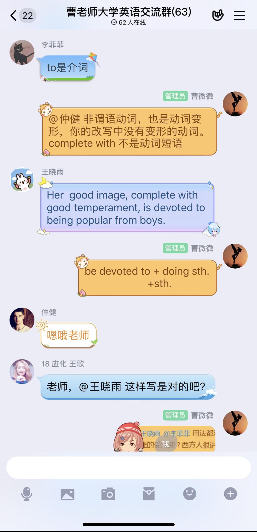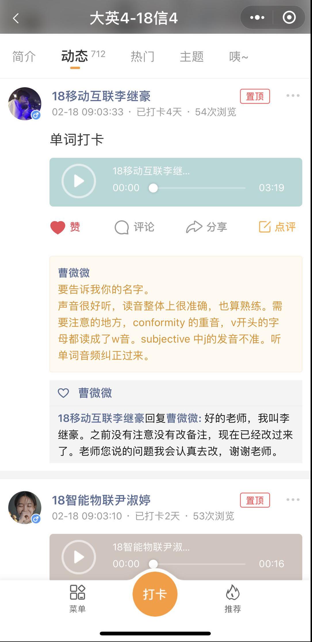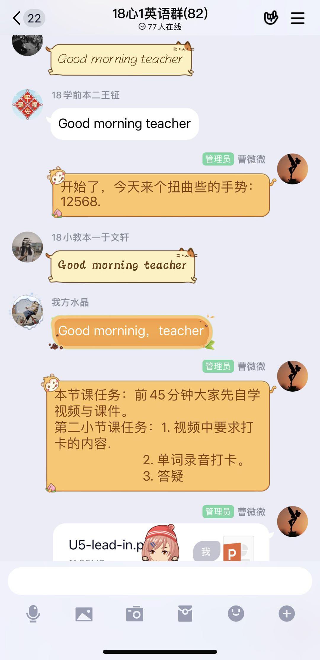 任课教师精心设计教学内容和教学环节,依托网络平台,结合QQ群、微信群、钉钉等即时通讯工具组织网上教学,进一步提升了学生的学习兴趣和积极性,收到了良好效果。本期我们来分享大学英语教学部曹微微老师采用“录播+U校园+QQ群+微信小打卡”等方式开展在线教学的典型做法。