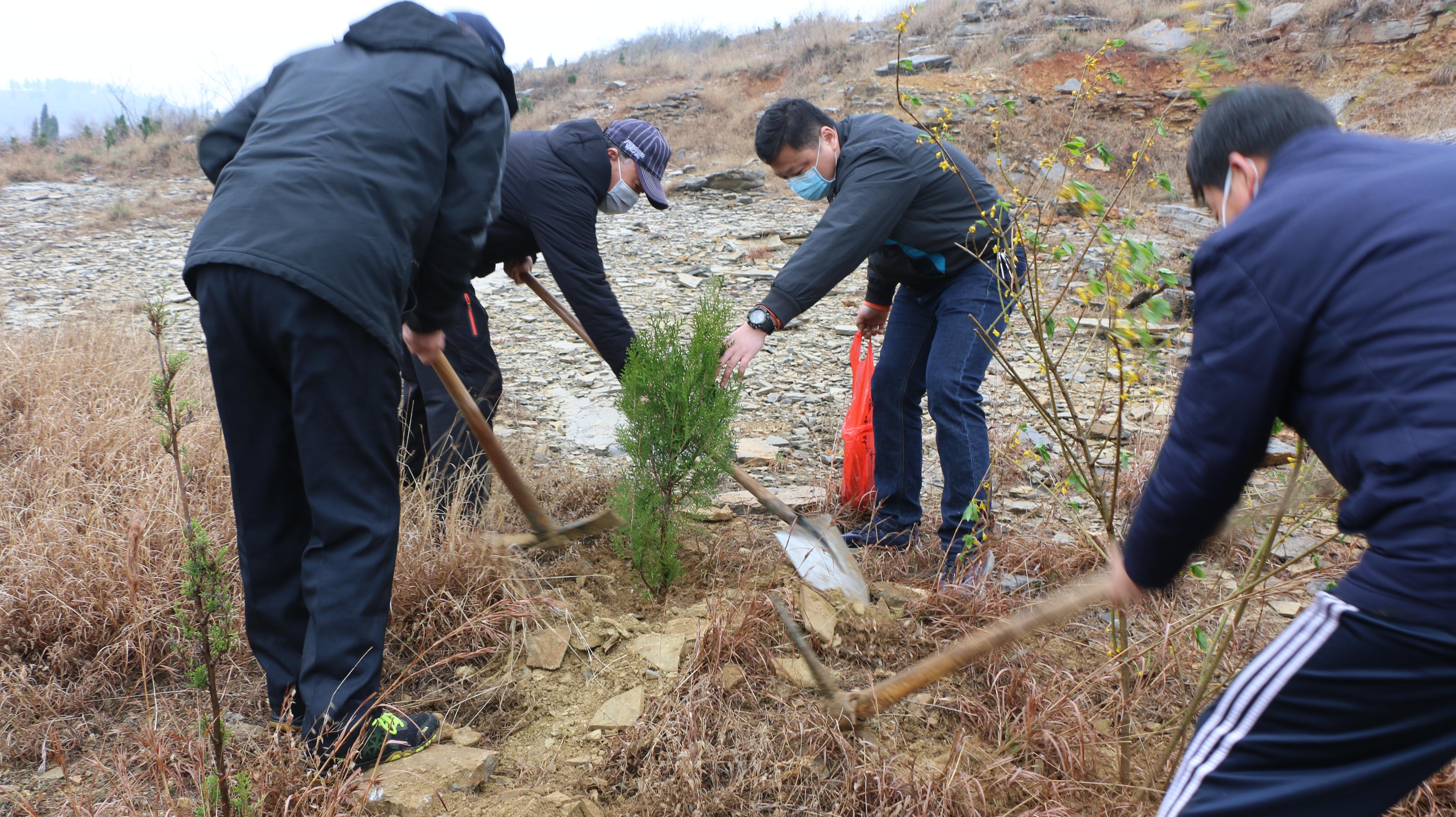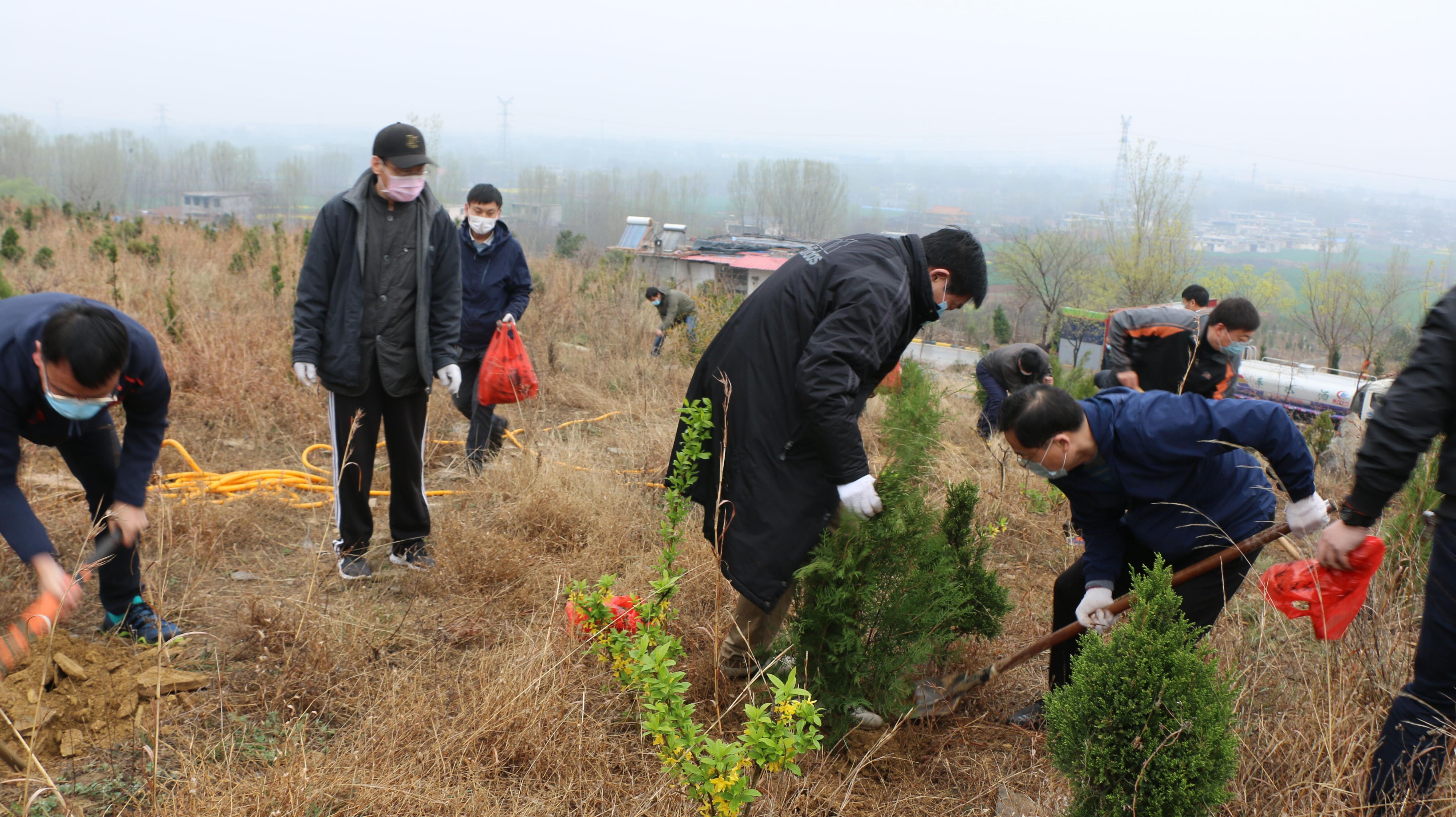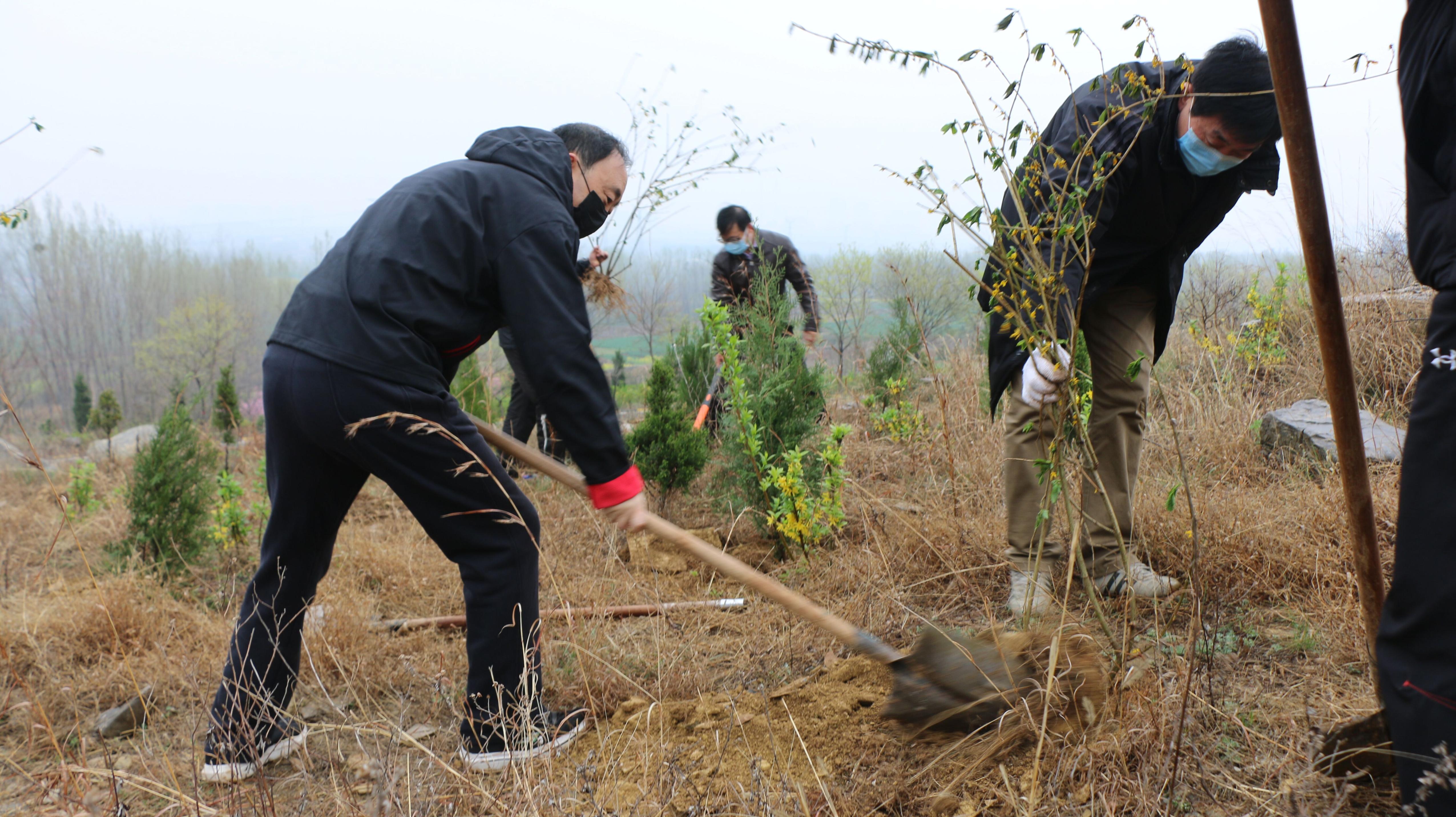 春雨沥沥,大家的衣服都被雨打湿了,鞋子上、裤腿上也沾满了泥巴,但大家毫无怨言、干劲十足,认真地为带来的侧柏、连翘等树苗安置“新家”。放眼望去,在春雨的滋润下,一棵棵新栽种的树苗傲然挺立,将山上点缀得生机勃勃、绿意盎然。植树过程中,全体人员均佩戴口罩,严格执行疫情防控措施。